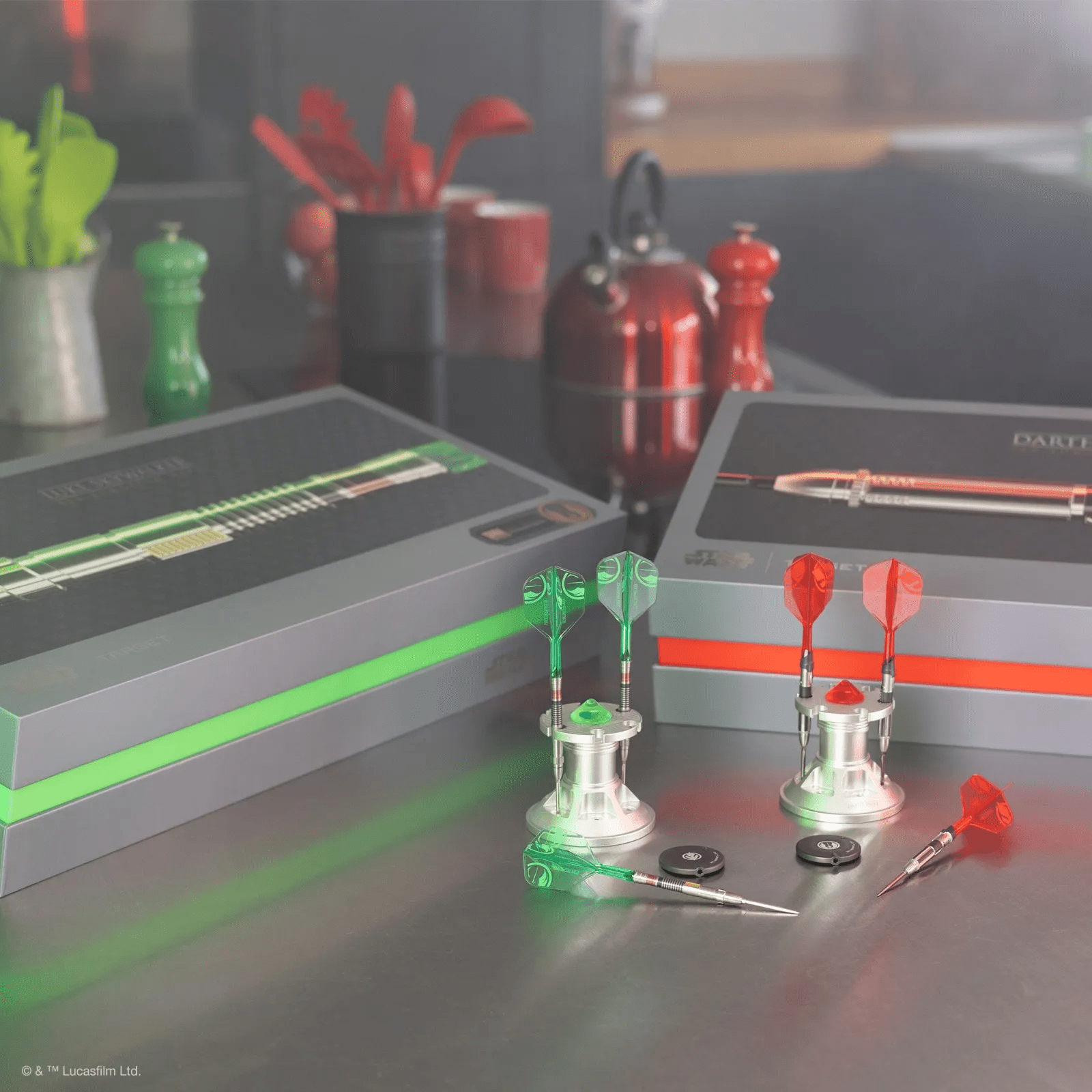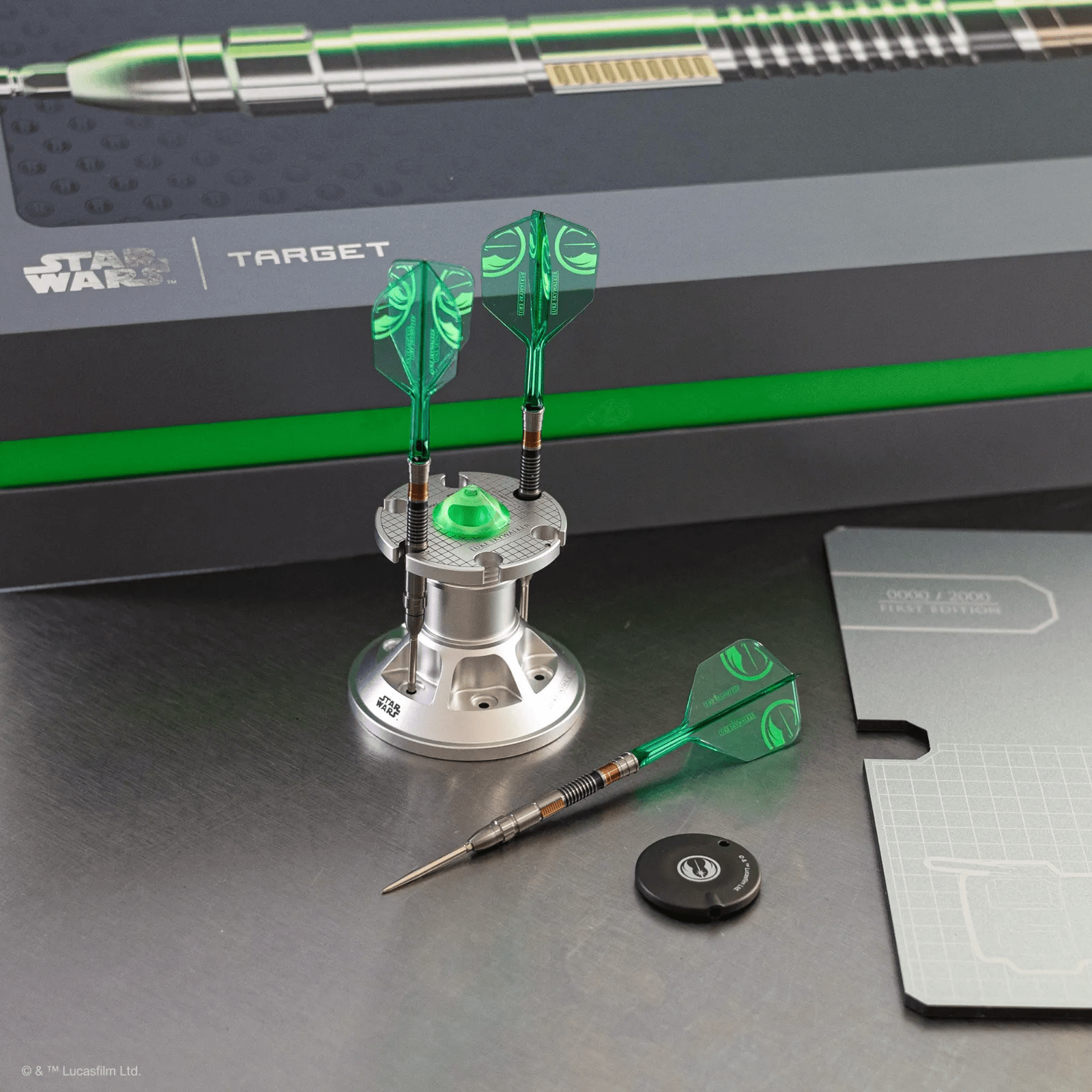 The setup is completed with K-Flex integrated flights and shafts in transparent green — designed to capture the vibrant glow of Luke’s Lightsaber while maintaining aerodynamic stability. Each set also includes an exclusive Lightsaber Display Stand, a premium collector’s piece that allows players to showcase their darts with pride and precision.