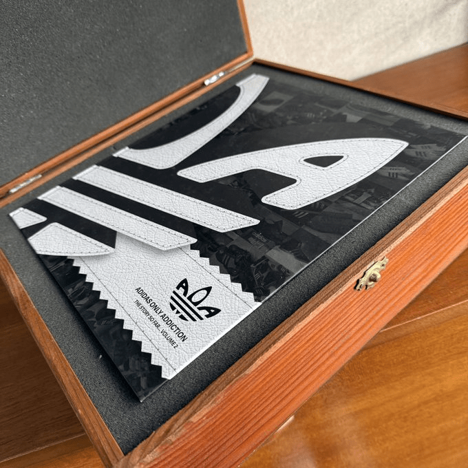 AOA ( ADIDAS ONLY ADDICTED) Limited Edition Book – includes wooden presentation case, pin badge, booklets, stickers, and other exclusives. The AOA Book is a limited edition publication created by and for enthusiasts of adidas footwear and culture.
